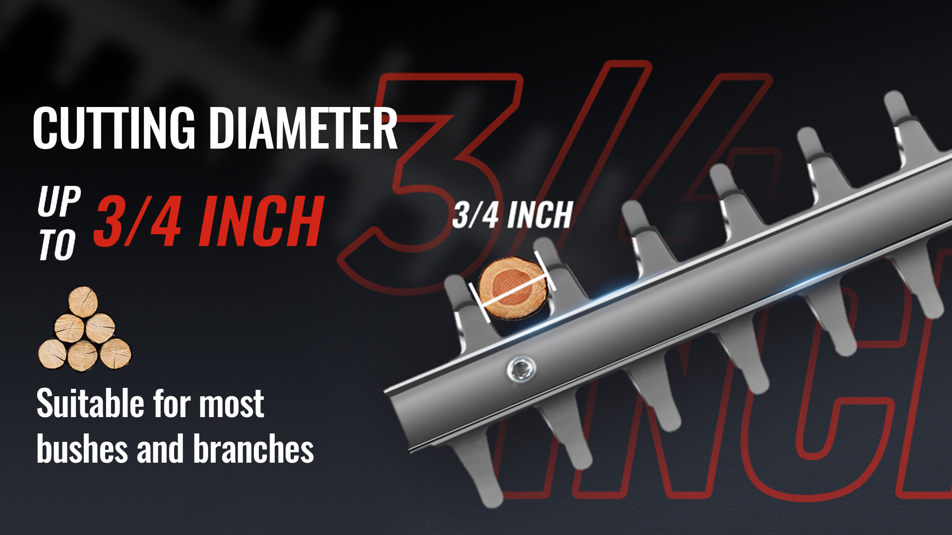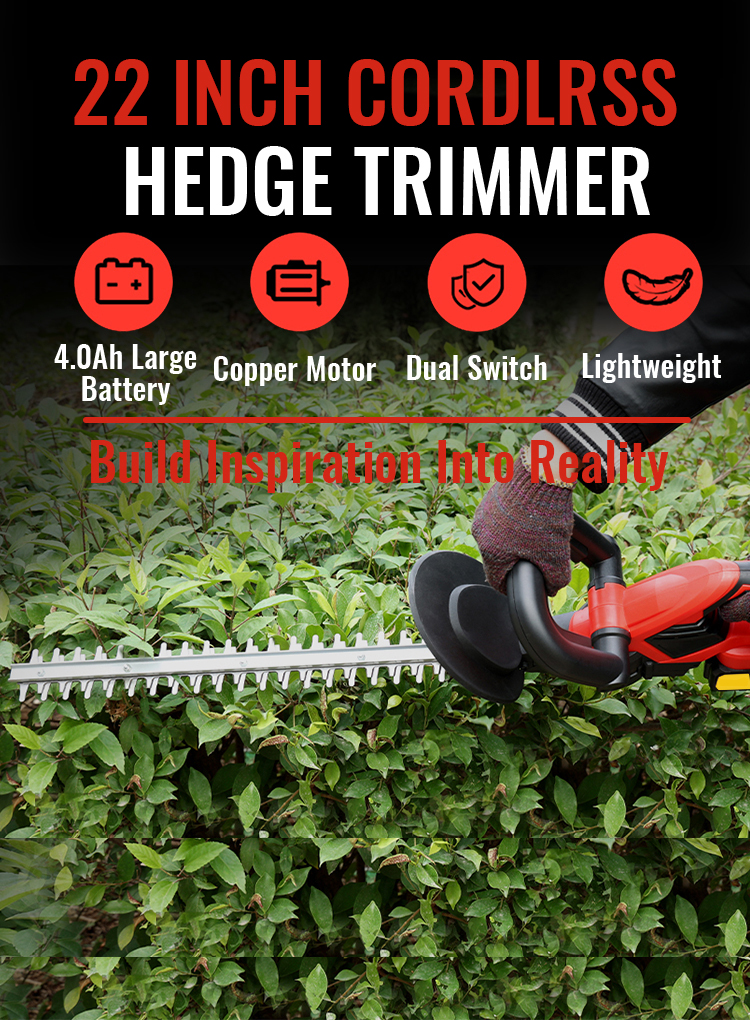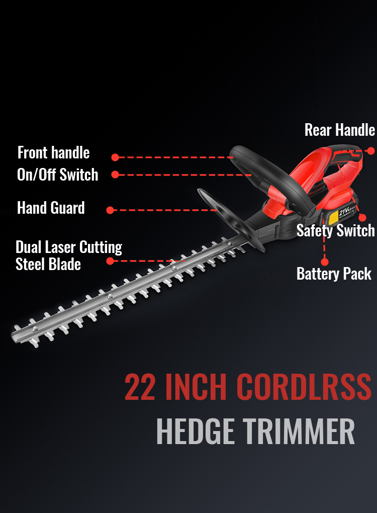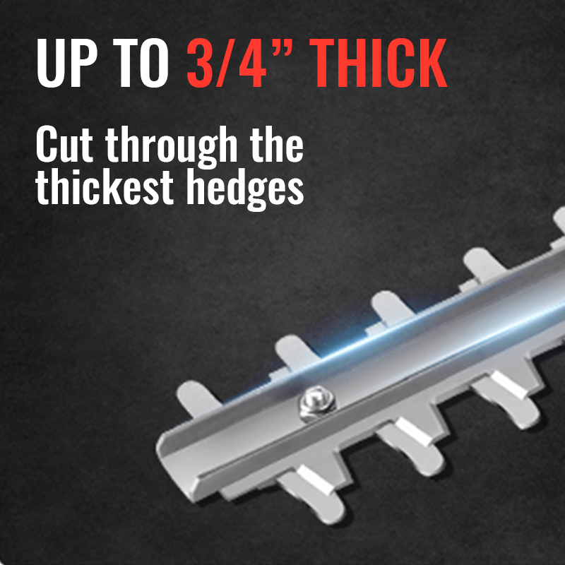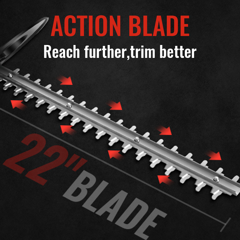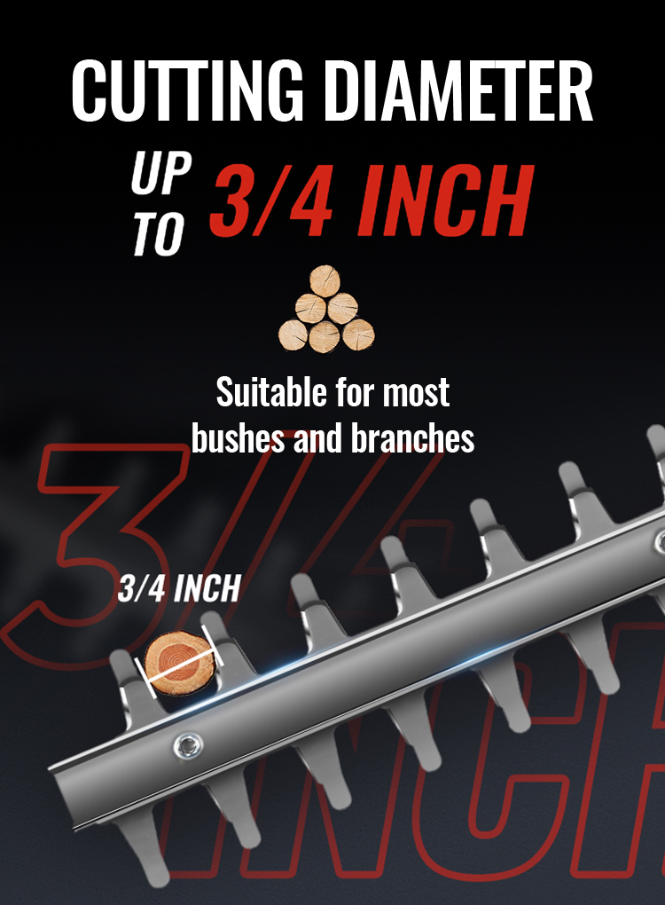 22 inches dual-action blades to ensures less vibration and low noise than single-action blades while trimming, cutting diameter up to 3/4", perfect for hedge, bushes and shrubs.