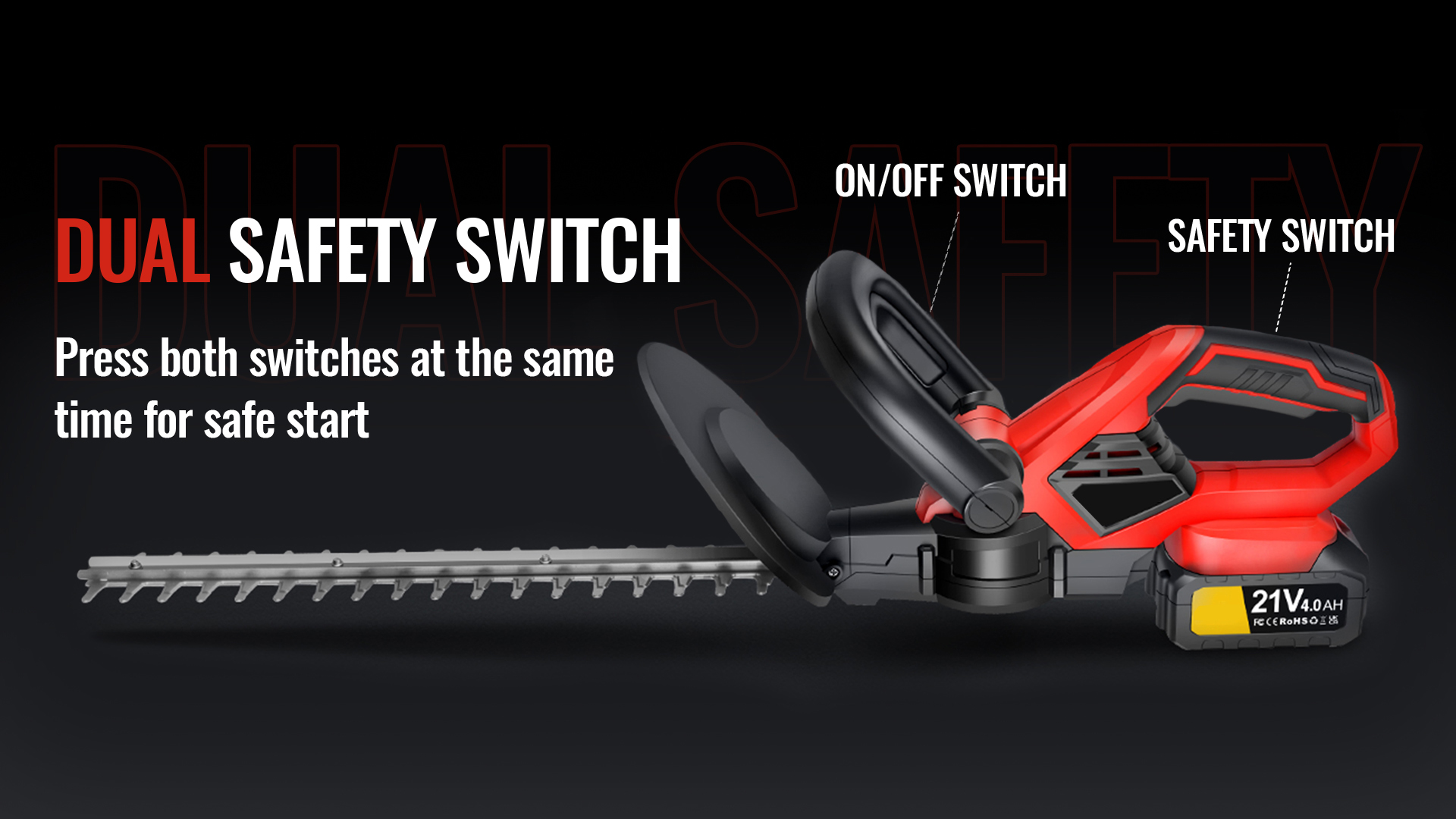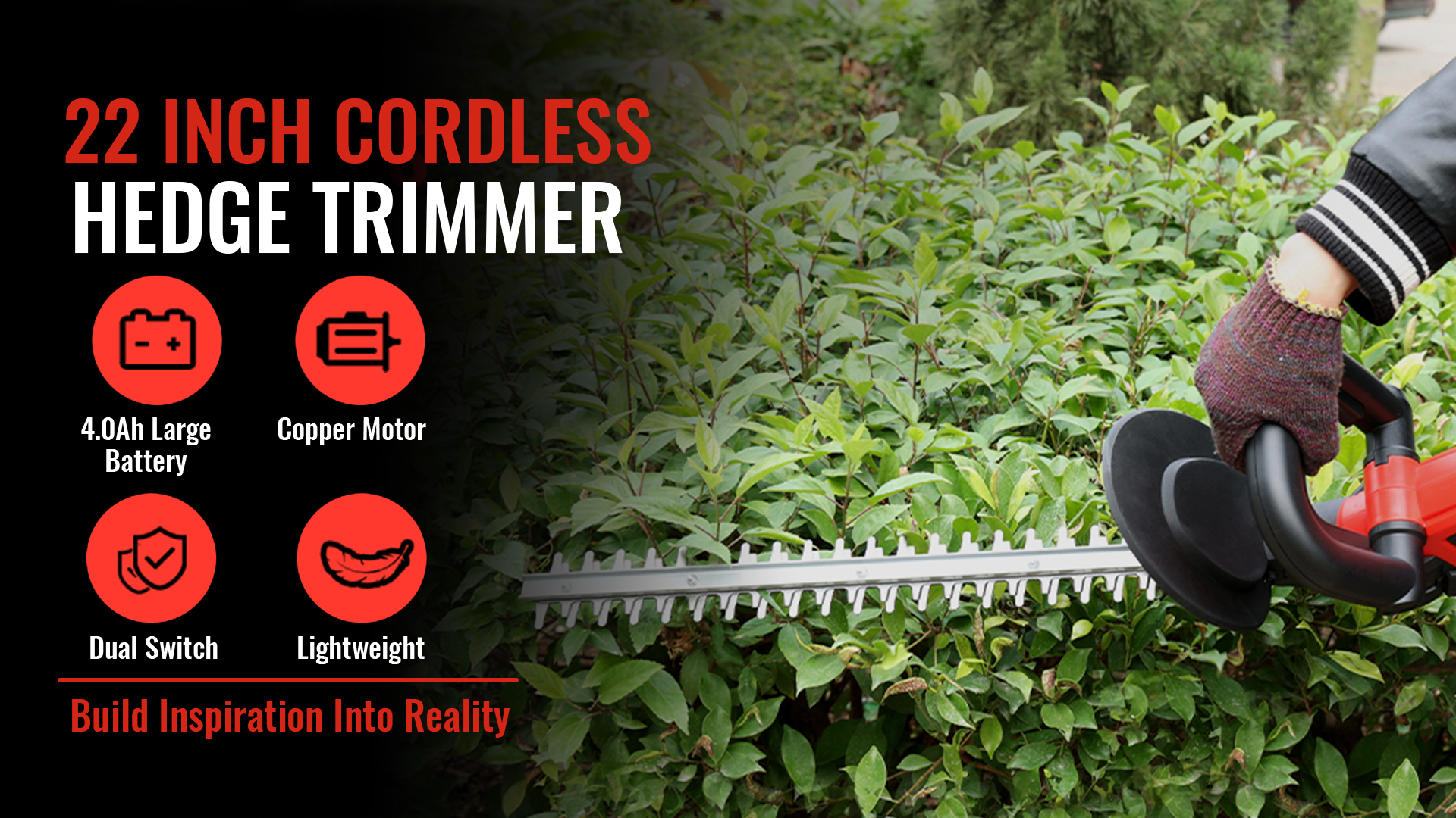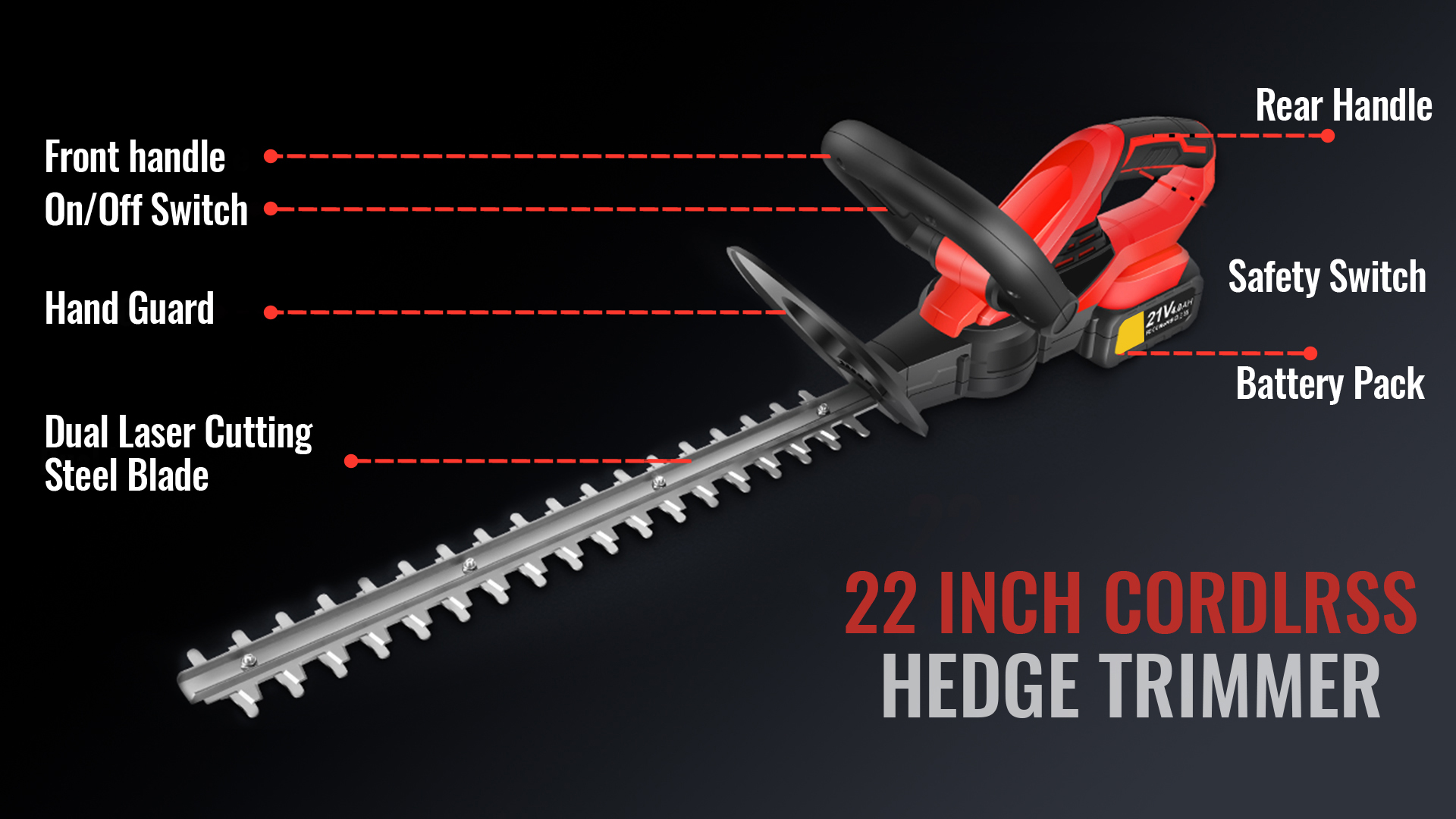 22 inches dual-action blades to ensures less vibration and low noise than single-action blades while trimming, cutting diameter up to 3/4", perfect for hedge, bushes and shrubs.