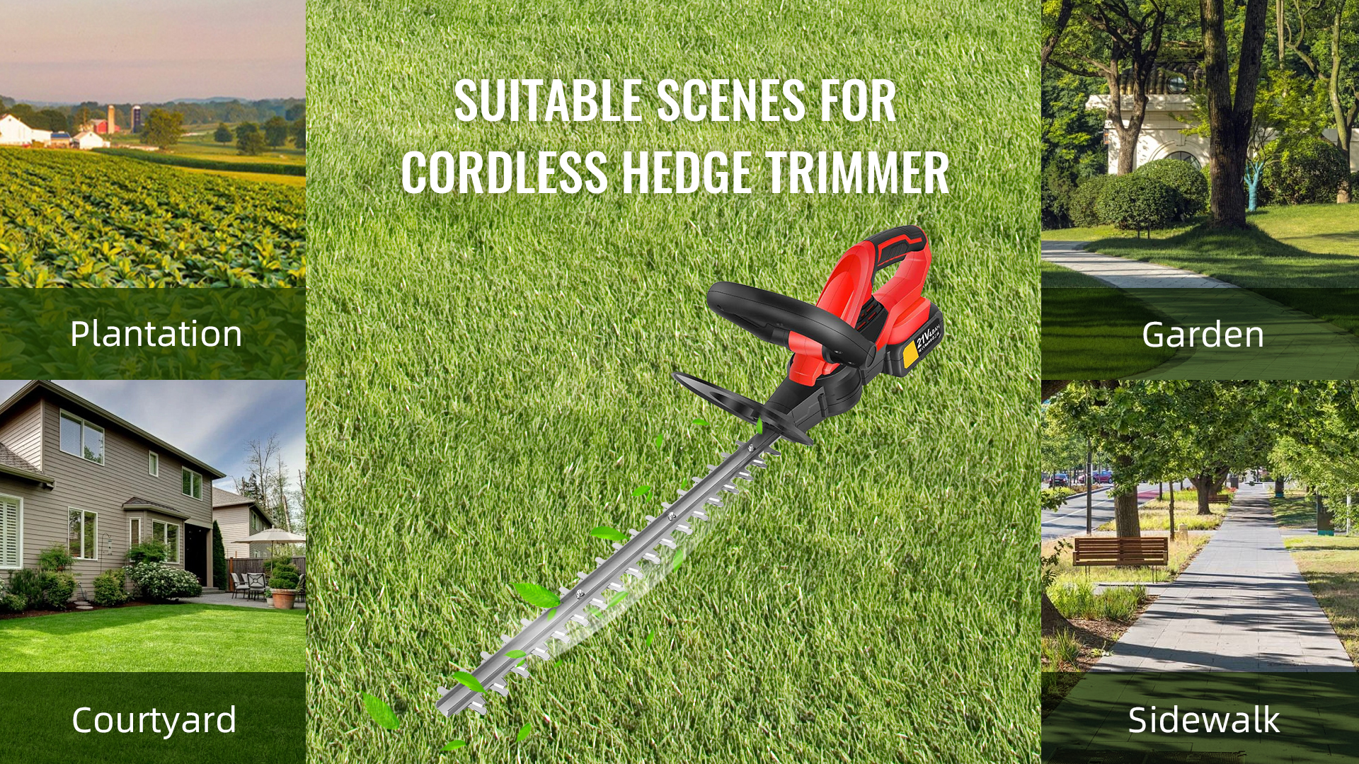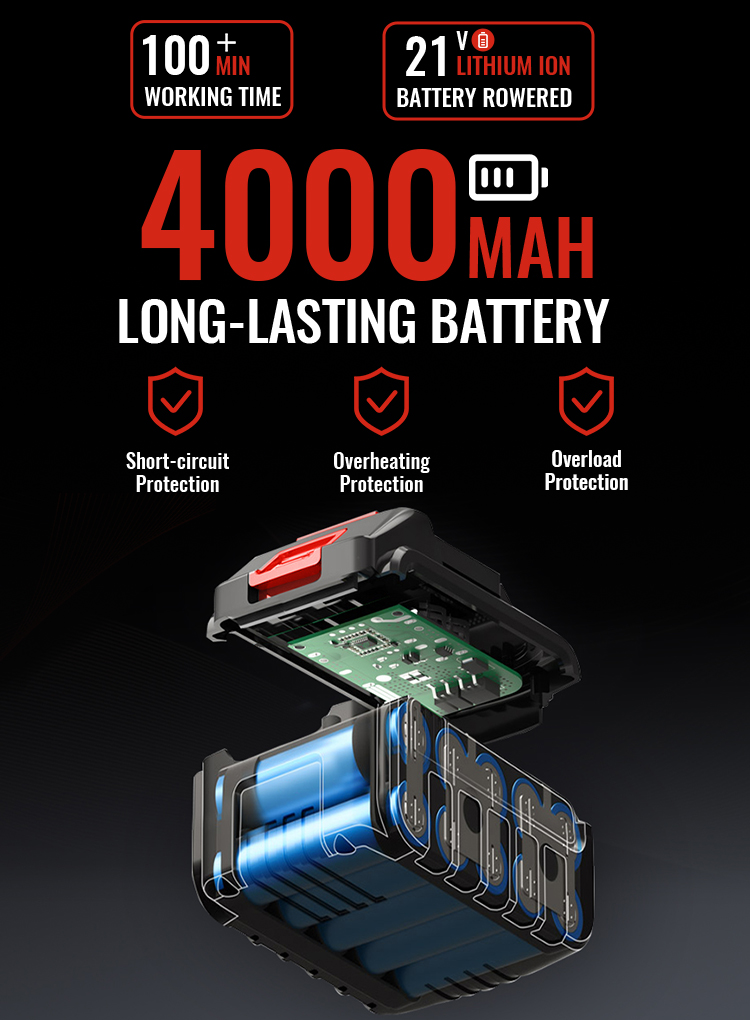 The electric hedge trimmer includes large 21V 4000mAh lithium-ion battery and a complimentary charger. The efficient battery can last for 80 minutes of daily work after a full charge, which is suitable for most trimming jobs. Larger battery to meet your power needs.