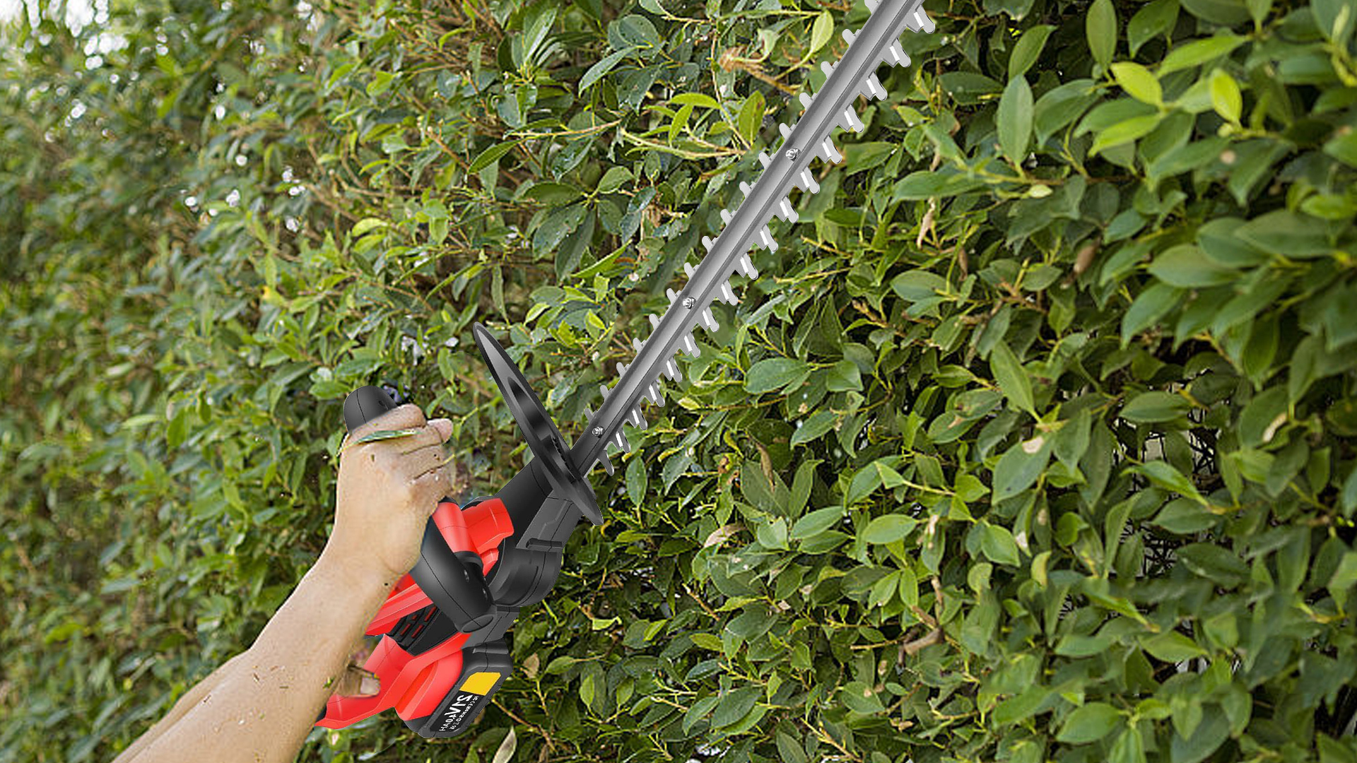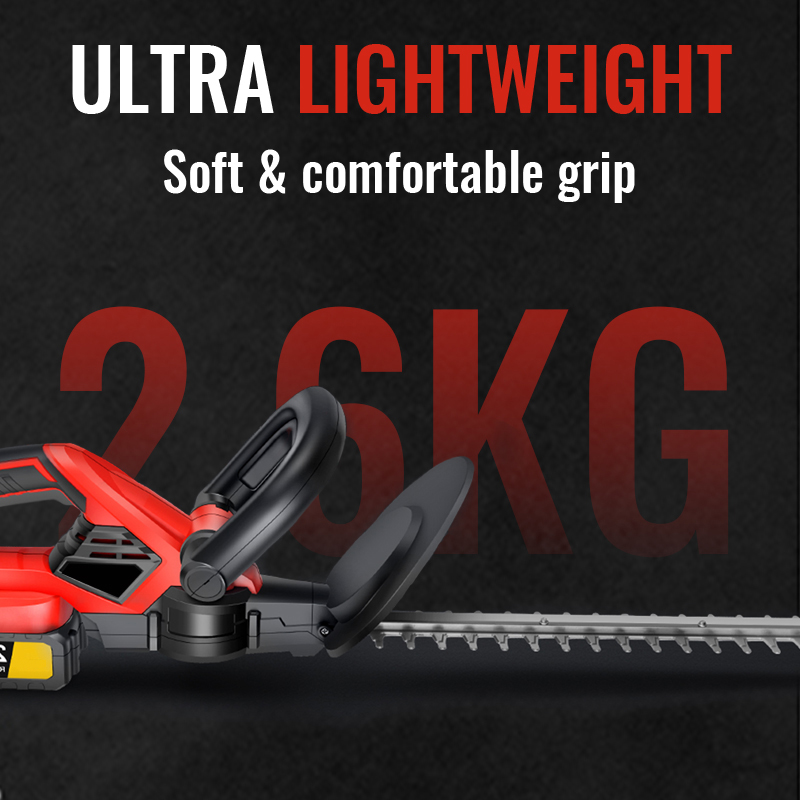 This battery hedge trimmer is about 5.7 pounds(2.6kg) and with ergonomic handle that you can hold the electric hedge trimmers for a long time without pressure on your wrist and suitable for women and the elderly.